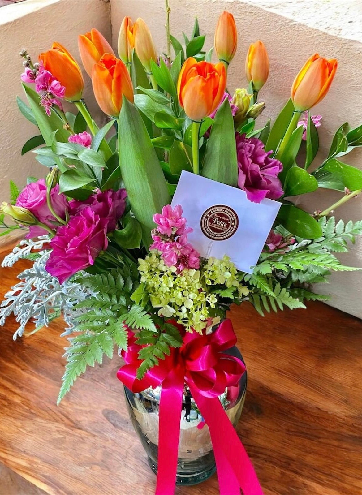 Jarrón floral de 10 tulipanes naranjas con lisianthus rosado y follajes finos en jarrón especial.