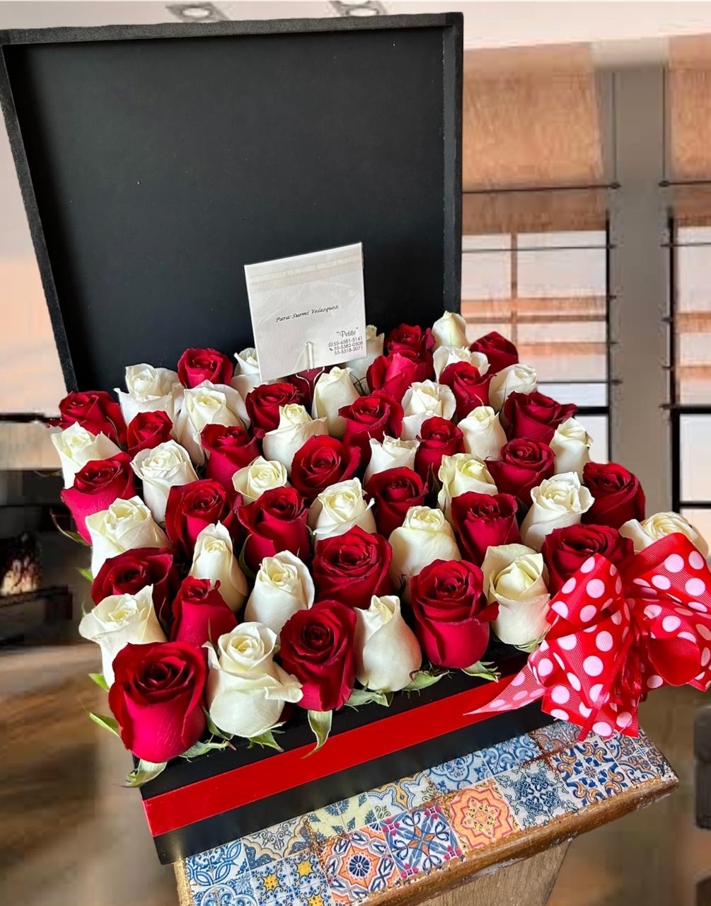 Baúl de madera especial con 55 rosas color rojas, con rosas blancas y moño decorativo especial.