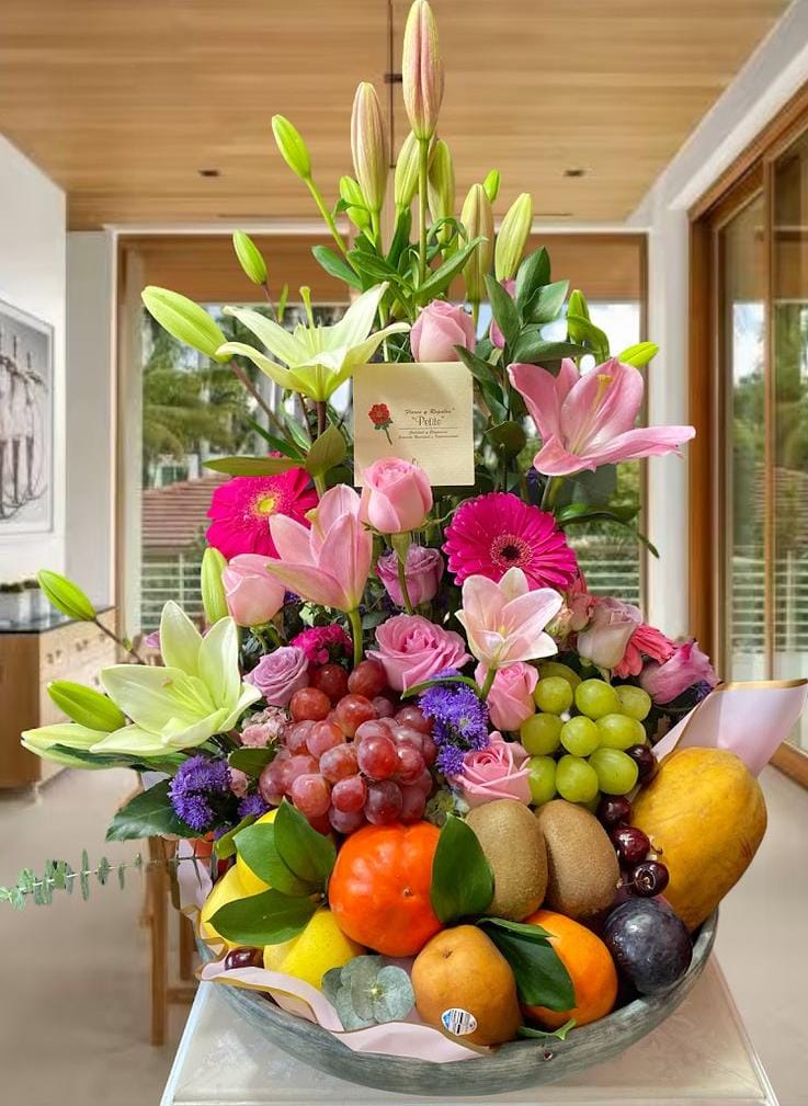 Arreglo frutal floral especial con lilis blancas, lilis rosas, gerberas, follajes finos con fruta de temporada especial en base de madera.